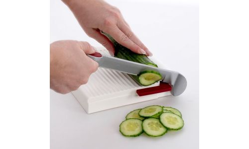 • Voordeel: in vergelijking met conventionele apparaten die met draad werken, snijdt de Fromarex met zijn mes ook harde worst, Parmezaanse kaas, ham, paprika, komkommer, radijs, ijsbergsla, enz.