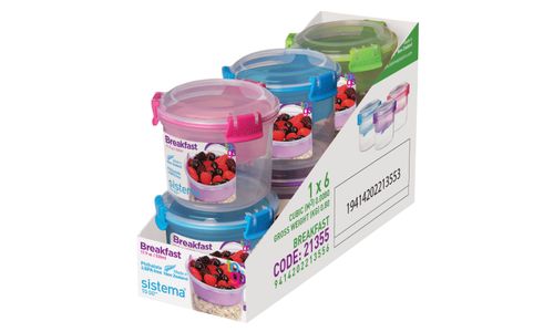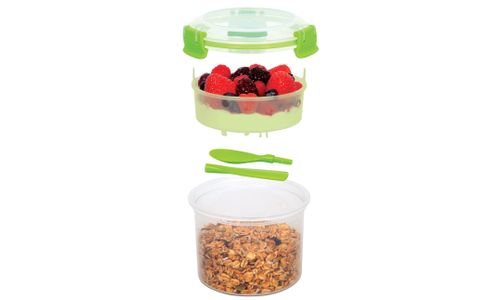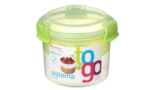 Maak het ontbijt gemakkelijk met de Sistema® Breakfast To Go™. Vul het onderste vakje met uw ontbijtgranen naar keuze, plaats het bakje erop met bessen of yoghurt en u hebt een voedzaam ontbijt onderweg. Door de handige lepel die in het deksel wordt geklemd, hoeft u ook geen apart bestek mee te nemen.