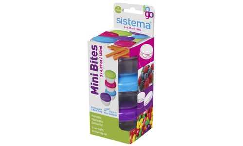 Voedseloplossingen voor drukke levensstijlen. De Sistema® Mini Bites To Go™ is perfect voor het meenemen van uw yoghurt, snacks, fruit en meer onderweg. Plaats uw snacks eenvoudigweg in de basis en draai de afsluitbare schroefdeksels dicht.