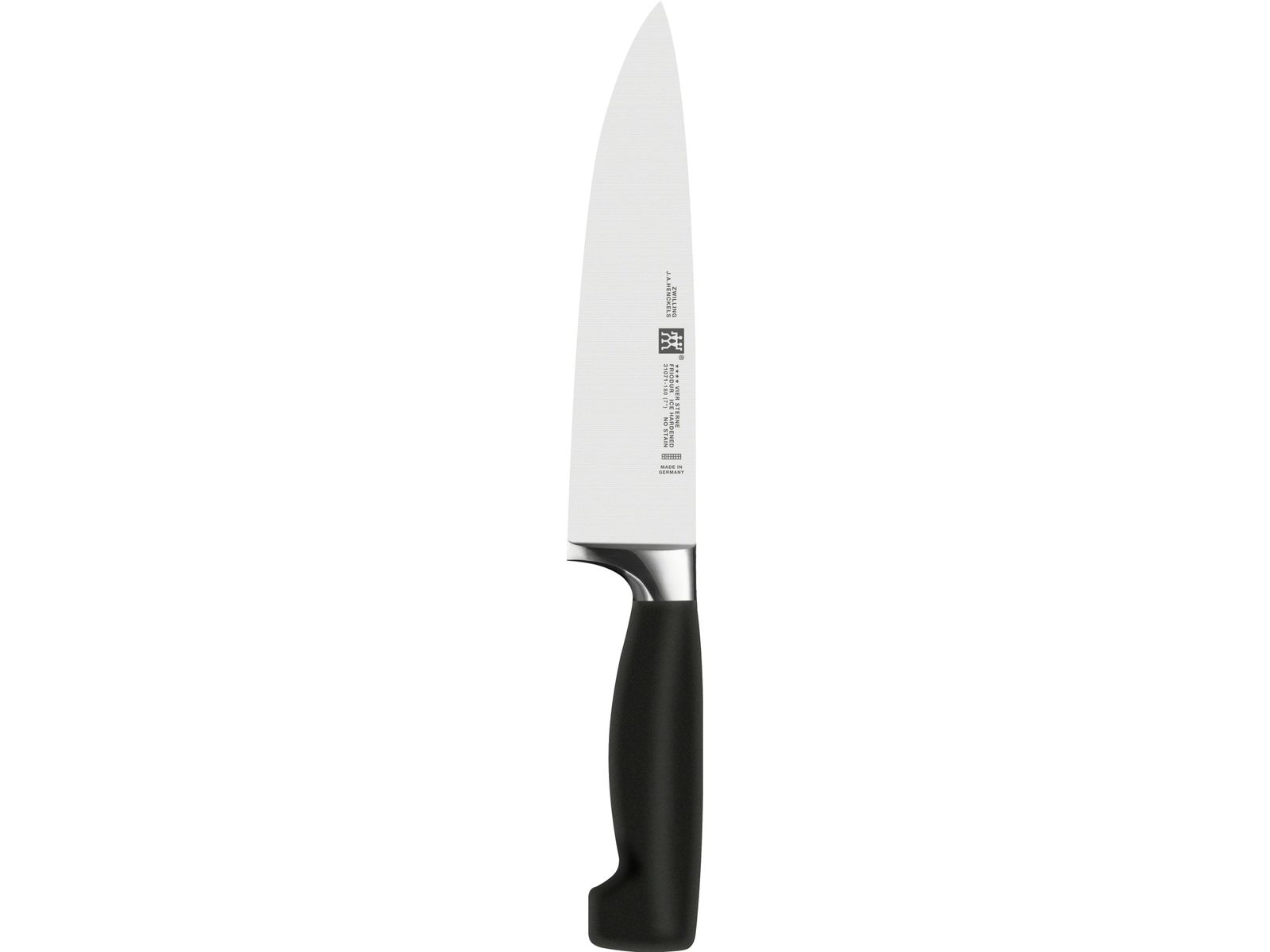 Voor het koksmes van de serie FOUR STAR is het lemmet van gesmeed staal. Het mes is lasergeëtst tijdens het bewerken en heeft dus een optimale snijhoek, waardoor u gemakkelijker voedsel kunt hakken. Dankzij een speciale ijsharding is het mes onbreekbaar en corrosiebestendig. Het handvat is gemaakt van massief plastic en naadloos verbonden met het mes. Dus vuil en bacteriën hebben geen kans met dit mes.