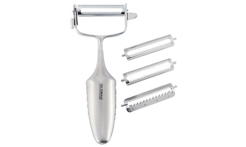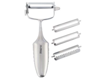 Met de Global 3-in-1 Dunschiller kunt u snel en veilig garnituren, salade toppings, Aziatische gerechten, citroenrasp en nog veel meer maken. De Dunschiller heeft 3 scherpe roestvrijstalen messen waarmee zelfs de meest taaie fruitsoorten en groenten geschild kunnen worden. Het comfortabele handvat verzacht de druk tijdens het schillen.