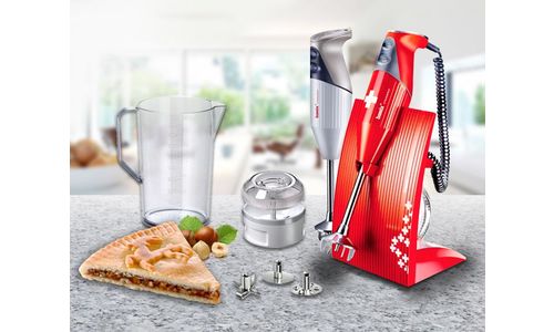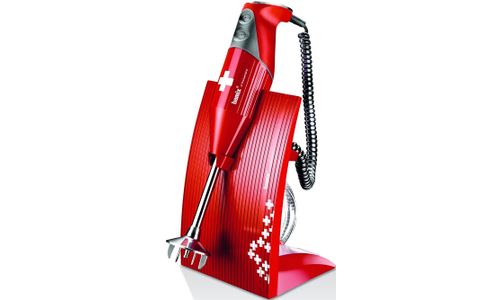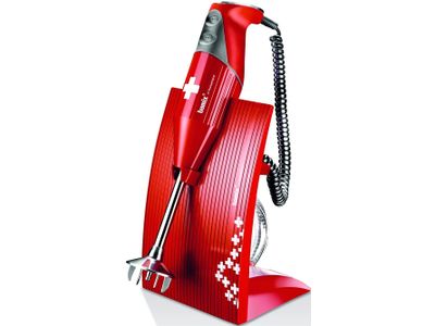Staafmixer (200 W) met 2 snelheden: 12.000 toeren/minuut + 17.000 toeren/minuut. De set (met statief) bestaat uit: 3 hulpstukken (klopper + menger + multi), een kruik met handvat en een processormolen . Uitvoering in Swiss cross red
