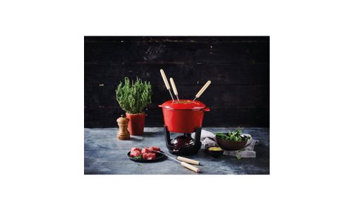 - Deze set bestaat uit 6 fonduevorken met houten handvat, 1 gietijzeren fondue pot, 1 spatdeksel uit gietijzer, 1 onderstel en 1 brander.