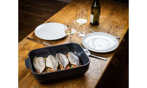 Een rechthoekige keramische schaal van 25 cm in een uiterst hedendaagse licht gesatineerde leisteenkleur. Een belofte van smaken voor diners met z’n tweetjes.