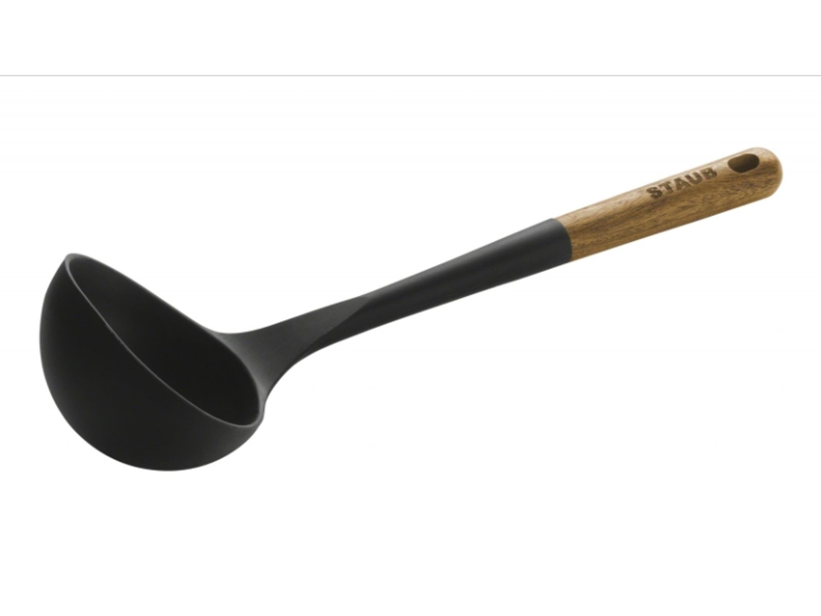 Deze pollepel is geschikt voor geëmailleerd gietijzeren braadpannen en pannen met een antikleeflaag, want hij is gemaakt uit mat zwarte silicone en krast dus niet. De lepel is 31 cm lang, zodat je comfortabel kan serveren uit grote potten en cocottes.