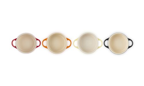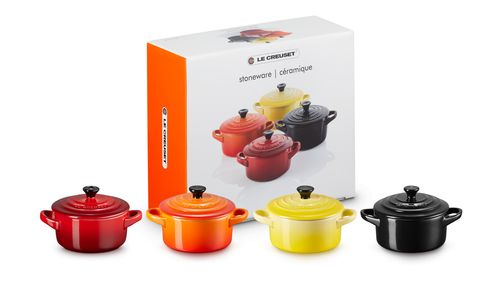 Een prachtige geschenkset met vier kleine aardewerken stoofpannetjes in de gedurfde Le Creuset-kleuren: Kersenrood, Flame, Zwart en Soleil. Deze schattige pannetjes zijn gemaakt van aardewerk en zijn geschikt voor de vaatwasser, oven, magnetron en vriezer. Gebruik ze voor het serveren van snacks, hapjes, desserts en voorgerechten.