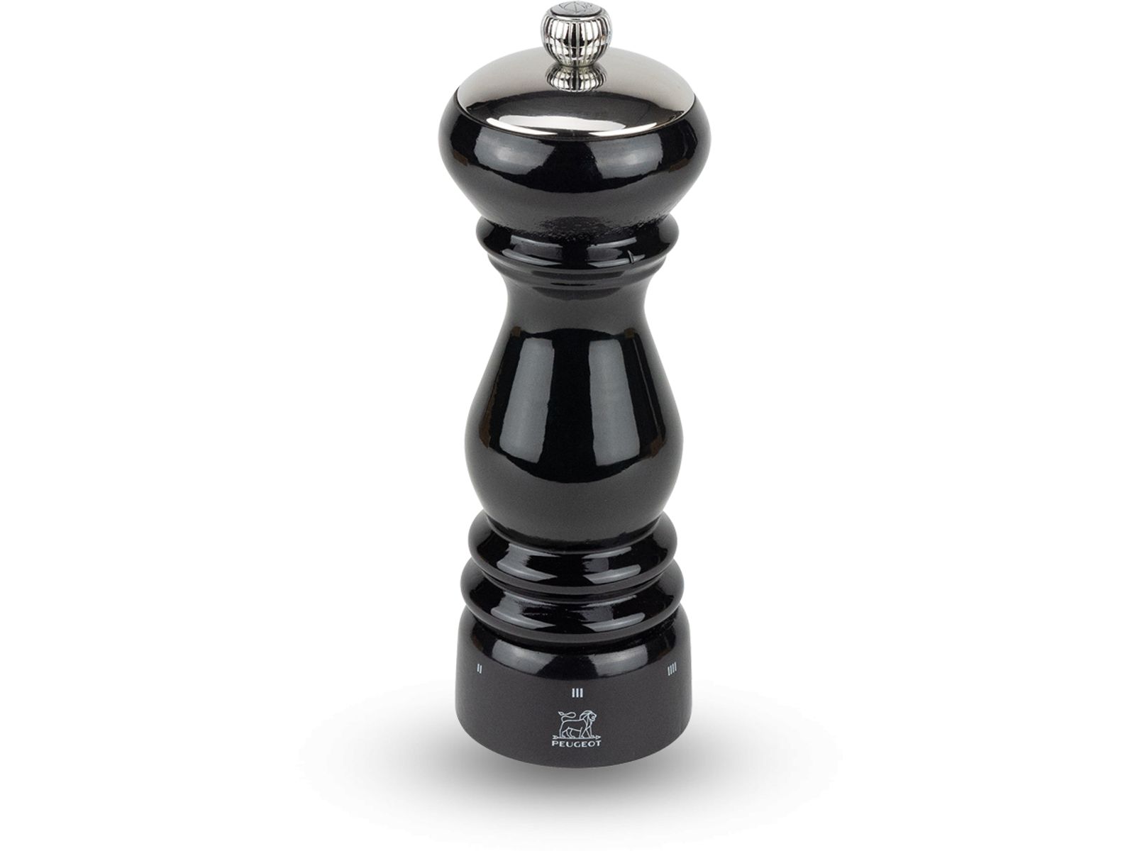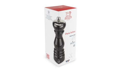 Met de zoutmolen Paris Icône gaat men hier in een hedendaagse versie terug naar het model Paris, de onbetwiste referentie van de molen zowel bij de chefs als bij hobbykoks. Paris Icône, de manuele zoutmolen uit hout 18 cm vertoont zich in een schitterende, zeer gesofisticeerde zwarte lak. Onder zijn zeer elegante verschijning verbergt hij alle prestaties en vindingrijkheid van de Peugeot-mechanica. Deze zoutmolen is immers uitgerust met een stalen maalwerk voor zout met onbeperkte garantie en een ingenieus gebrevetteerd systeem voor een instelbare maalgraad om in enkele seconden precies de maalgraad van het zout in te stellen met een enkele beweging. Stel de maalgraad in op 1 om het zout zeer fijn te malen en op 6 voor een grovere maling. Deze schitterende, prestigieuze molen is een waar decoratiestuk dat een hedendaags accent aan uw tafels zal geven.