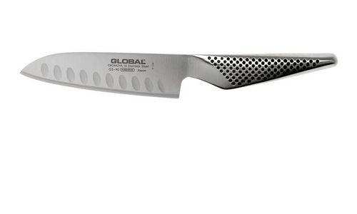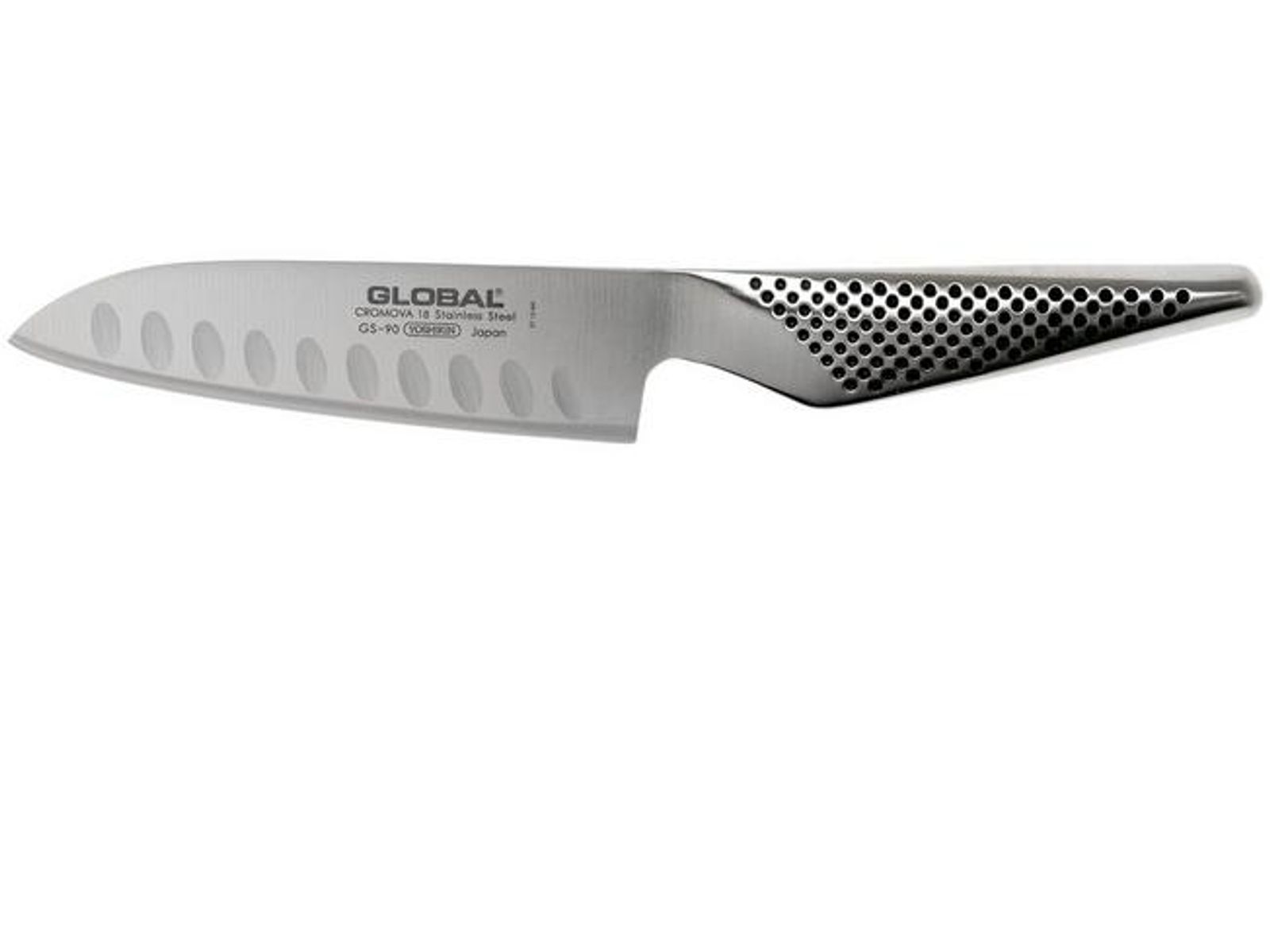 De Global GS-90 santoku is de opvolger van de GS-37. Het is in de basis hetzelfde mes, alleen staan de kuiltjes in het lemmet nu diagonaal, in plaats van verticaal. Doordat je met de richting van de kuiltjes meesnijdt, zal het snijwaar nog minder gauw aan het mes blijven plakken.