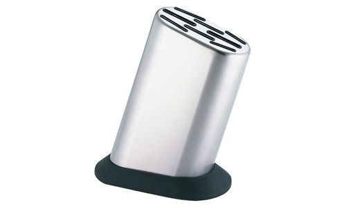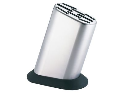 Geborsteld RVS messenblok met zwart hardrubberen basis.