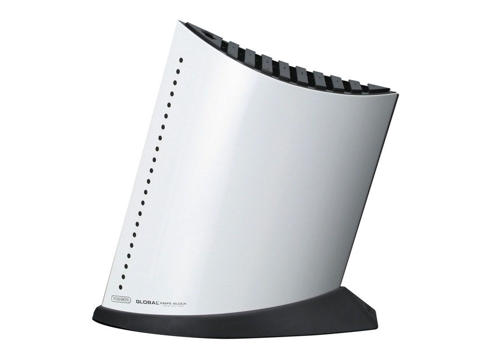 Geborsteld RVS design messenblok boot met zwart hardrubberen basis.