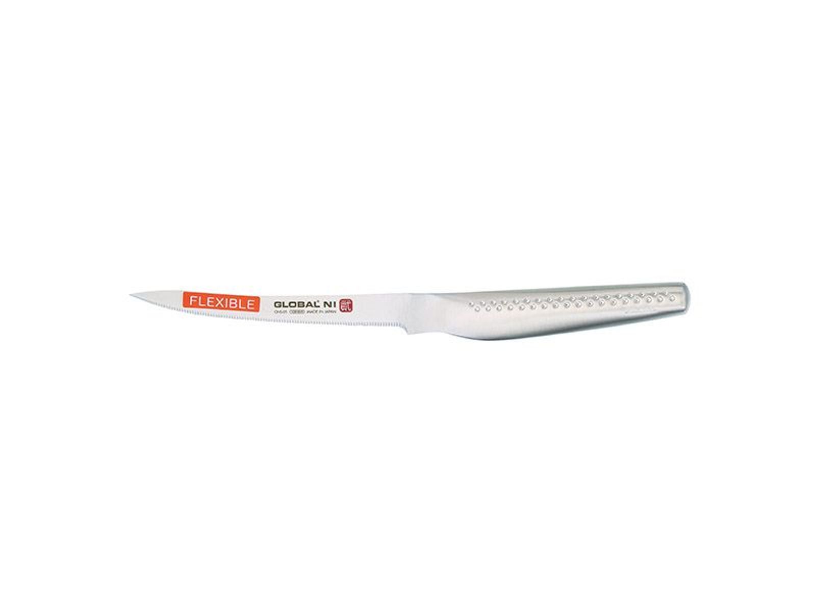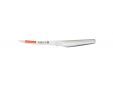 Het GNS-05 tomatenmes heeft de vorm van een klassiek uitbeenmes en wordt daarom gebruikt als een klein uitbeenmes dat goed is voor het fileren van vis. De lichte karteling op het mes maakt het ook geweldig voor het snijden van tomaten of andere groenten met een heel zacht of waterig midden, waar het uitoefenen van druk op het fruit terwijl je het doorsnijdt overal een explosie van de inhoud kan veroorzaken! Het hebben van een gekarteld mes maakt het een stuk gemakkelijker. Dit Global Ni tomatenmes is gemaakt van cromova roestvrij staal met een 3-laags gehamerd lemmet. De holle verzwaarde handgreep zorgt voor een perfecte balans met een stevige maar comfortabele grip.