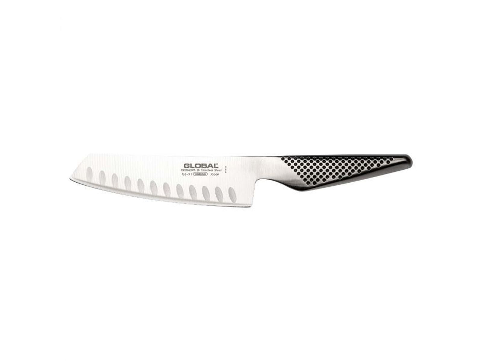 De GS-91 is het gecanneleerde mes in de klassieke Japanse nakiri-stijl. Het is perfect voor het snijden van groenten van sla, uien, kool en komkommers. Als je veganist bent of onlangs een gezondere levensstijl hebt aangenomen, dan zou dit mes ideaal zijn om alles gesneden en klaar te krijgen. Het heeft ook een geribbelde rand die voorkomt dat stukjes groenten aan het mes blijven kleven, dit komt omdat het luchtbellen verzamelt in het geribbelde gebied van het mes terwijl je het snijdt, waardoor de groenten niet blijven plakken. Je kunt ook kiezen voor een santokumes dat een goede allrounder is en ook door professionele koks wordt gebruikt voor het snijden van groenten maar ook voor andere dingen in de keuken. Als je op zoek bent naar meer dan alleen een nakiri-mes, dan is onze set van 3 messen die naast dit mes voor het najaar van 2019 is uitgebracht, de G-779146 die een koksmes, nakiri-mes en een schilmes bevat. Als dit mes met 14 cm te klein voor je is, kun je ook voor een groter mes van hetzelfde type gaan, namelijk de G-81, een nieuw mes dat dit najaar 2019 is uitgebracht en 18 cm meet.