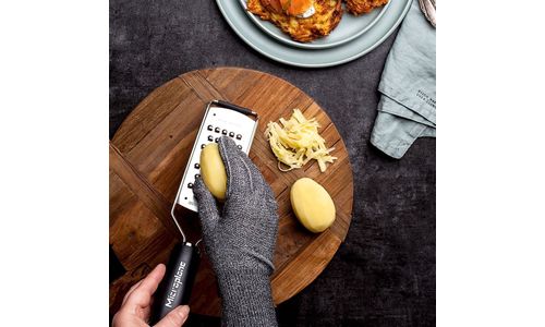 Ongevallenbescherming voor de voorzichtige. De Microplane® snijbestendige handschoen zorgt voor een veiligere voedselbereiding met zijn uniek geconstrueerde, machinewasbare, lichte en comfortabele ontwerp. Gemaakt van kunstmatige vezels, de "one size fits most" handschoenvormen passen snel in elke hand.
