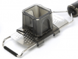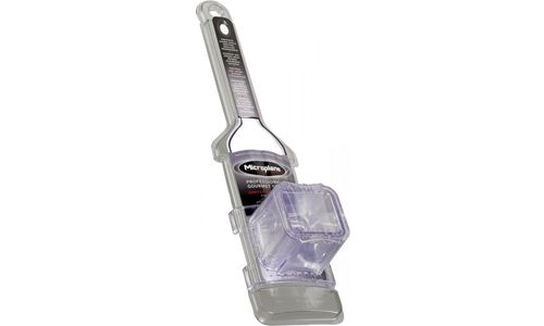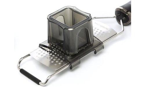 Deze voedselbeschermer schuift op de rail van de Gourmet Series Paddle Graters (behalve de Ultra Coarse Grater). Doe kleinere voedingsmiddelen, zoals knoflook, gember, chocoladechips, noten en kleine groenten in de trechter, druk op de zuiger en rasp! Met dit accessoire kunt u deze voedingsmiddelen eenvoudig raspen zonder dat uw vingers in de weg zitten van de ultrascherpe messen.