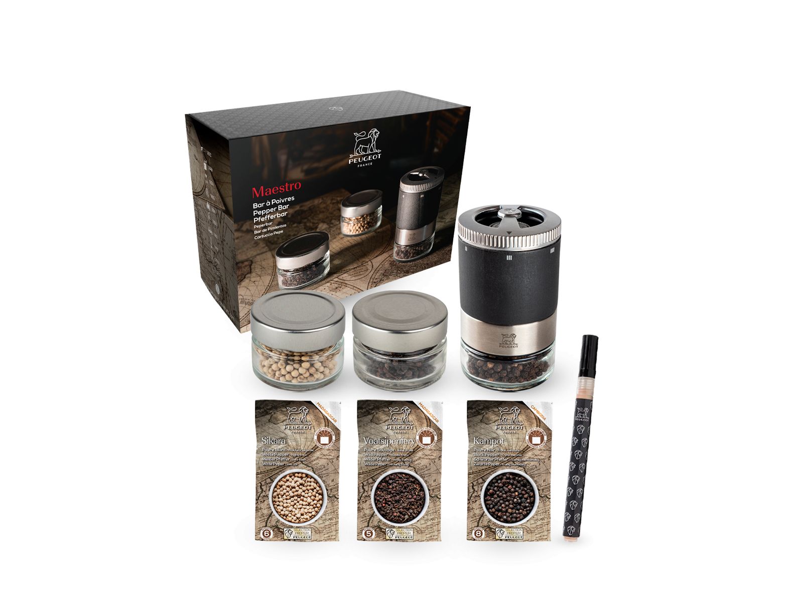 Peugeot Maestro Peperbar, u'Select pepermolen met 3 geweldige pepers, 3 verwisselbare reservoirs, een viltstift en een adviesboekje