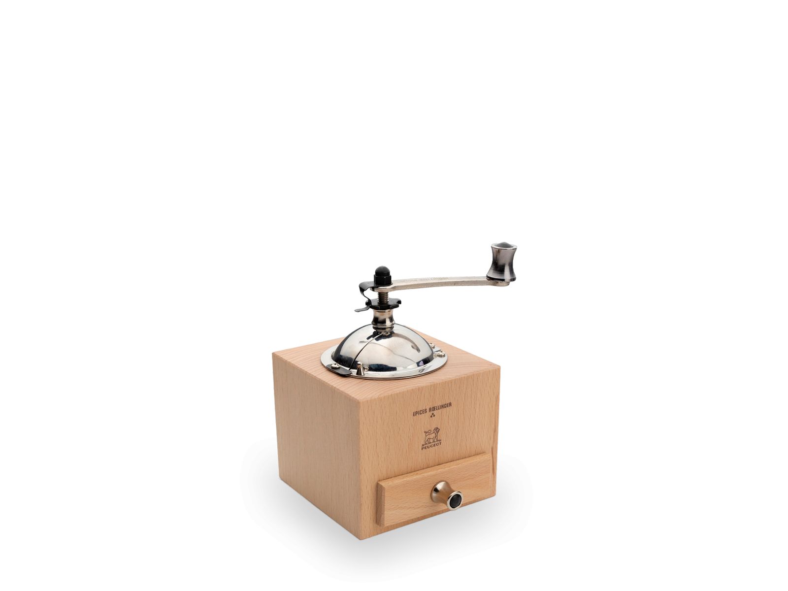 Deze nieuwe, natuurlijke houtkleur vergezelt de twee eerste kleuren in de collectie: rood en chocolade. De natuurlijke kleur, beschermd met lak, onthult alle schakeringen van het hout, de geometrie van zijn nerven, de knoesten … Kortom, de hele geschiedenis van een boom! De details van deze molen lieten zich bezielen door voorwerpen uit het leven op zee en de winch van zeilschepen. Want uiteindelijk zijn specerijen parfums die oceanen oversteken. Het ergonomische, speelse model doet denken aan de traditionele molens van Peugeot en tegelijk aan de scheepsvaart. Het hout van het traditionele laatje werd uitgehold en vormt een mooi, rond opvangbakje. Dankzij die ronde bodem verzamel je de verse peper zonder ook maar één kostbaar korreltje te verliezen.