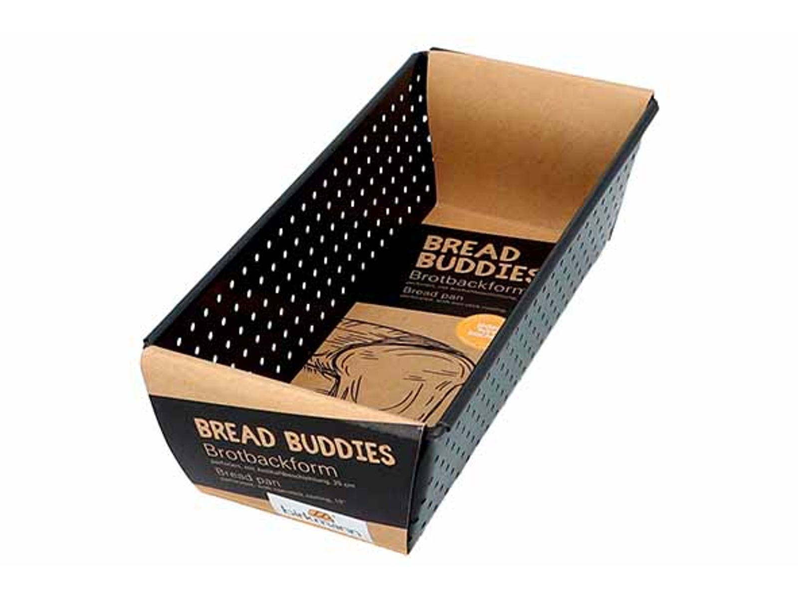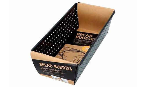 Dan moet u het misschien zelf eens proberen, want bakken maakt u blij en ontspant u. En wij weten waar we het over hebben. Er zijn veel redenen om zelf brood te bakken. Een belangrijke is bijvoorbeeld dat uw brood zo vrij is van toevoegingen, kunstmatige rijsmiddelen of conserveringsmiddelen. Een andere is dat u geld bespaart. Om u te helpen bij deze onderneming, hebben we de bijpassende broodbakvormen. Deze zijn gemaakt van speciaal geperforeerd en zeer hoogwaardig koolstofstaal en staan ??voor een uitzonderlijk goede warmtegeleiding. De fijne perforaties laten overtollig vocht ontsnappen tijdens het bakken. Het resultaat: zelfgebakken, goed brood - knapperig van buiten en luchtig zacht van binnen. We hebben ook gedacht aan een goede antiaanbaklaag, zodat u uw brood na het bakken gemakkelijk uit de vorm kunt halen. Overigens zijn de vormen uit de Bread Buddies-serie verkrijgbaar in 3 verschillende maten. In 20 cm, als mini-versie voor het kleine huishouden of de kleine Appeti, en in 30 cm als XL-versie. Wij hopen dat u geniet van het gebruik van onze bakvormen. Misschien probeert u wel een van onze favoriete recepten uit, die u kunt lezen via de QR-code op de verpakking. Wij ontvangen graag foto's, feedback of geweldige suggesties.