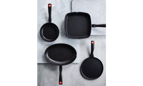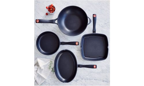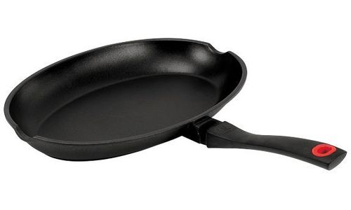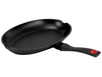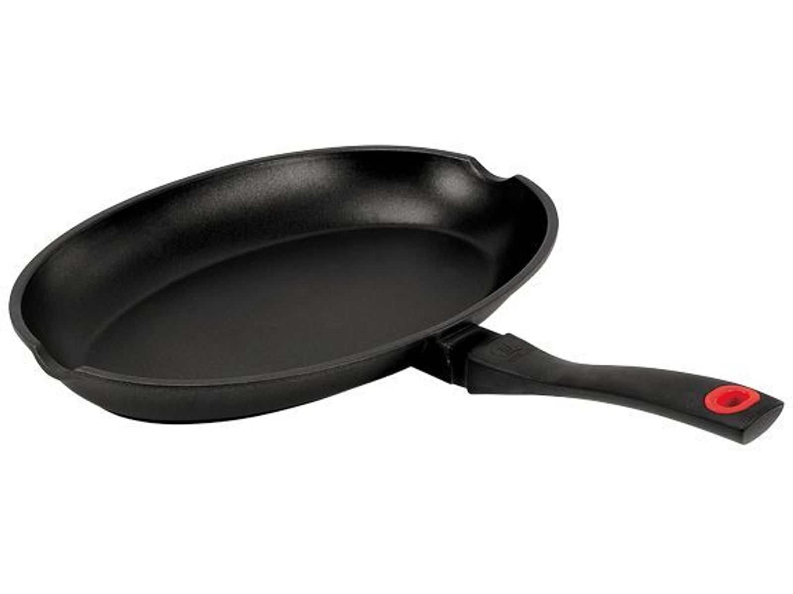 - De ovale vormige pan laat toe de vis op zijn geheel te bakken.