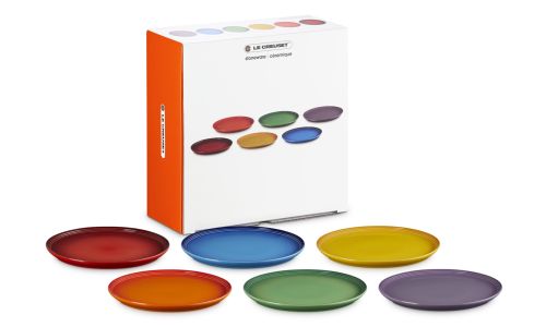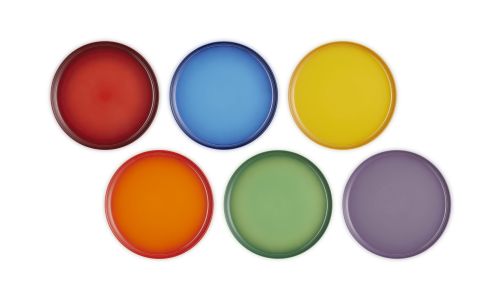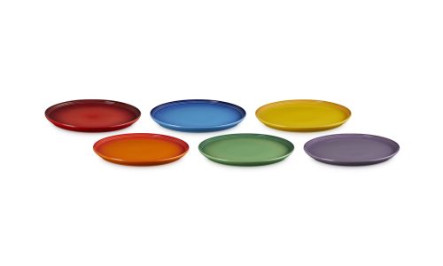 Fleur elke maaltijd op met deze prachtige set van zes dinerborden in Aardewerk, elk afgewerkt in een stralende, regenboogtint. Ze zijn royaal en zijn sierlijk gevormd, en brengen stijl naar je eettafel - of het nu gaat om een casual lunch of een speciaal feest. Prachtig verpakt en klaar om te schenken; een attent cadeau voor foodies, gastheren en -dames of fans van opvallende ontwerpen.